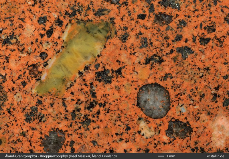 Außerdem gibt es in diesen Porphyren immer wieder einzelne, meist grünlich gefärbte Plagioklase, die ebenfalls aus der mafischen Schmelze oder einem plagioklasdominierten Gestein wie z. B. Anorthosit stammen, das beim Aufstieg vom Granitmagma aufgenommen wurde. Die Reste davon sind die in den Ringquarzporphyren steckenden grünlichen, oft mehrere Zentimeter großen Plagioklase (Bild 4). Sie sind häufiger als die schwarzen Xenolithe zu finden.