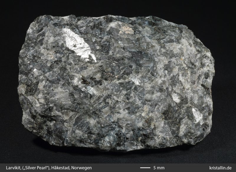 Der graue Larvikit (Bild 1), mit der Handelsbezeichnung „Silver Pearl“, stammt aus Håkestad/Norwegen (Anstehendstück). Es handelt sich um eine grobkristalline, gleichkörnige Variante mit großen Rhomben, die im Bild als spiegelnde Fläche zu sehen sind.