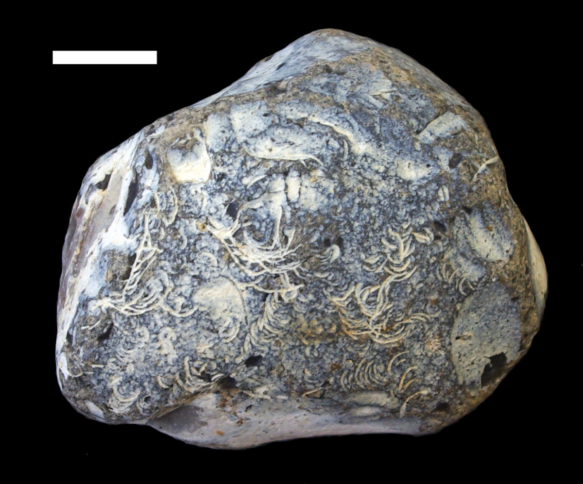 Feuerstein mit durch Gletscherbewegung erzeugten Parabelrissen und heller Patina, Slg. LUNG MV (leg. W. SCHULZ, MV014154, Maßstab 2 cm)